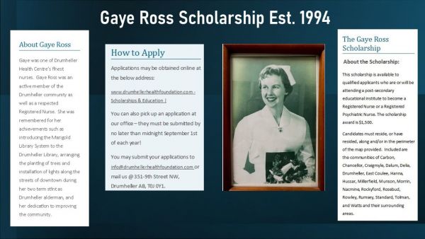 The Gaye Ross Memorial Nursing Scholarship is currently accepting applications for post-secondary students entering or enrolled in the Registered Nursing Program for the 2025/2026 school year. Deadline for applications is September 1st. 2025 at midnight. The scholarship amount is $1,500.00. Please visit https://www.drumhellerhealthfoundation.com/scholarships for the application form and instructions. Inquiries and applications can be directed to