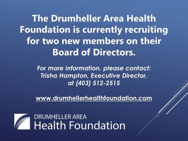 The Drumheller Area Health Foundation is currently recruiting for two new Board members on its Board of Directors. If you would like to make a difference in health care in our community, please contact Trisha Hampton, Executive Director, at 403.512.2515 for more information.