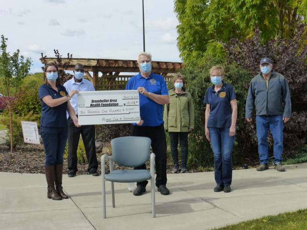 On September 16th, 2021, Rotary Club of Drumheller presented a $10,108.80 cheque to the Drumheller Area Health Foundation to purchase 48 chairs for the Drumheller Health Centre to meet COVID transmission prevention protocols. The chairs will be placed in Acute Care rooms, Continuing Care rooms, and the waiting rooms in the hospital, so they can be easily cleaned to meet COVID protocols and enhance patient and visitor safety. Attending the cheque presentation were (left to right):
