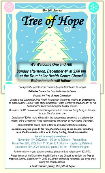After being cancelled for two years, the Tree of Hope is back for 2022! You can donate online at https://www.drumhellerhealthfoundation.com/online-donations by selecting your Gift Designation as Tree of Hope - Palliative Care. In the Comments, you can provide your ornament and Greeting of Hope information. Join us on Sunday, December 4th at 2:00 pm to light the Tree of Hope!