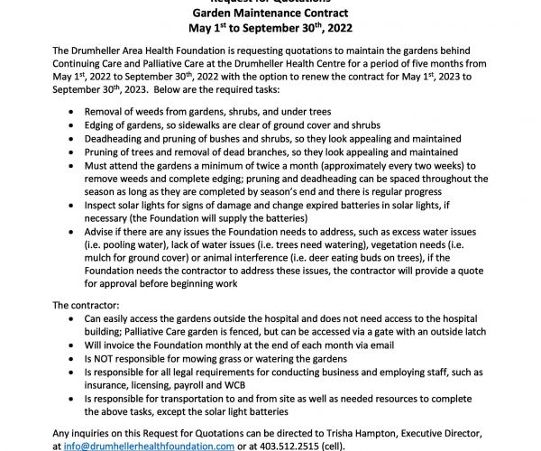 The Drumheller Area Health Foundation is requesting quotations for the maintenance contract of the healing gardens at the Drumheller Health Centre from May 1st to September 30th, 2022. For more information, please see the request for quotations for more information. Quotes are due Wednesday, March 9th, 2022 before 5:00 pm and can be submitted via email at