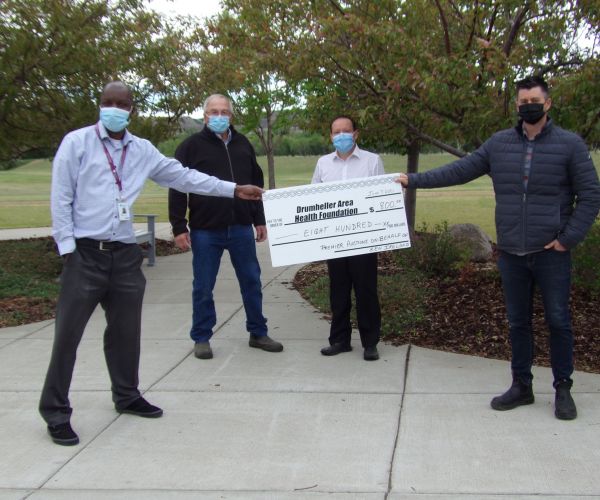 On Monday, June 7th, 2021, Premier Auctions on behalf of Ken Ireland presented a $800 cheque to the Drumheller Area Health Foundation to purchase equipment for the Drumheller Health Centre of the Greatest Need. Pictured from left to right: Nathan Banda, Site Manager, Drumheller Health Centre; Gary Krabsen, Treasurer, Drumheller Area Health Foundation; Scott Kuntz, Vice Chair, Drumheller Area Health Foundation; Adam McLane, Vice President, Premier Auctions
