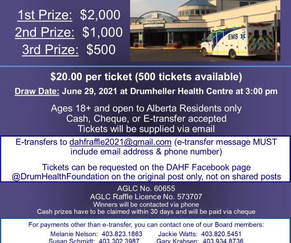 The Drumheller Area Health Foundation is conducting a cash raffle to raise funds for equipment of the Greatest Need for the Drumheller Health Centre with three cash prizes of $2,000, $1,000 and $500. The raffle is posted on our Facebook page (@DrumHealthFoundation) and tickets cost $20 each. There are 500 tickets available and you must be an 18 or older Albertan resident to purchase. Tickets can be purchased by commenting on the original Facebook post and sending an e-transfer for payment to…