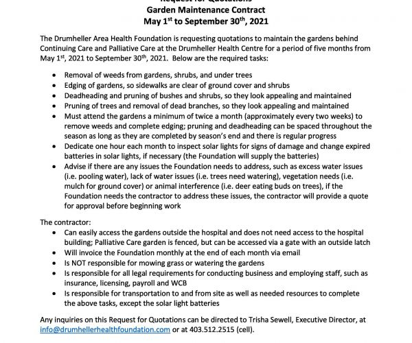 The Drumheller Area Health Foundation is requesting quotations for the maintenance contract of the healing gardens at the Drumheller Health Centre from May 1st to September 30th, 2021. For more information, please see the request for quotations for more information. Quotes are due Thursday, March 25th, 2021 before 5:00 pm and can be submitted via email at