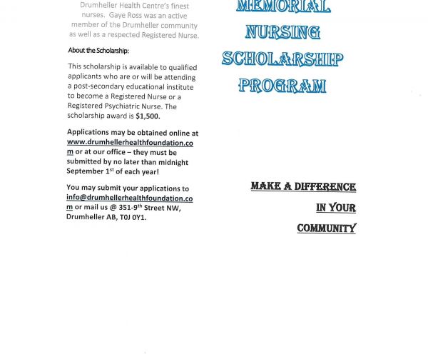 Was created in memory of one of the Drumheller Health Centre's finest nurses. Gaye Ross was an active member of the Drumheller Community as well as a respected Registered Nurse.