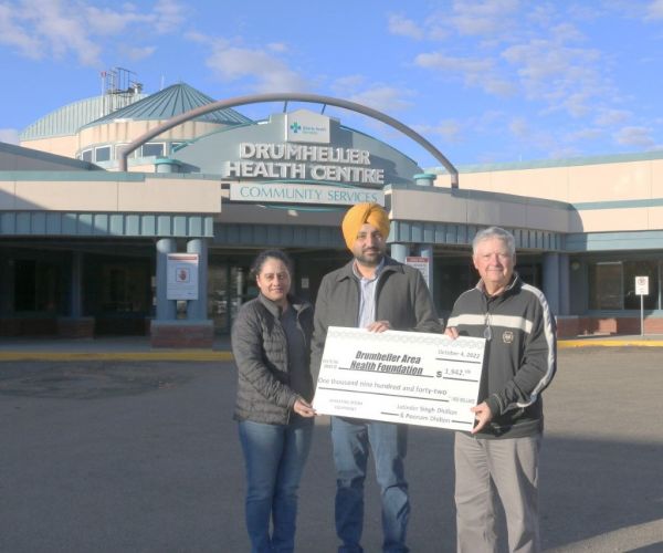 A BIG THANK YOU to Jatinder Singh Dhillon and Poonam Dhillon, both temporary foreign workers, for presenting a $1,942.09 cheque to the Drumheller Area Health Foundation on October 11th, 2022 towards Operating Room Equipment for the Drumheller Health Centre. This donation will be put towards a hysteroscope and other accessories to support the Drumheller Health Centre’s surgical program. Pictured Left to Right: Poonam Dhillon, Jatinder Singh Dhillon, and Tom Zariski (Director, Drumheller Area Health…