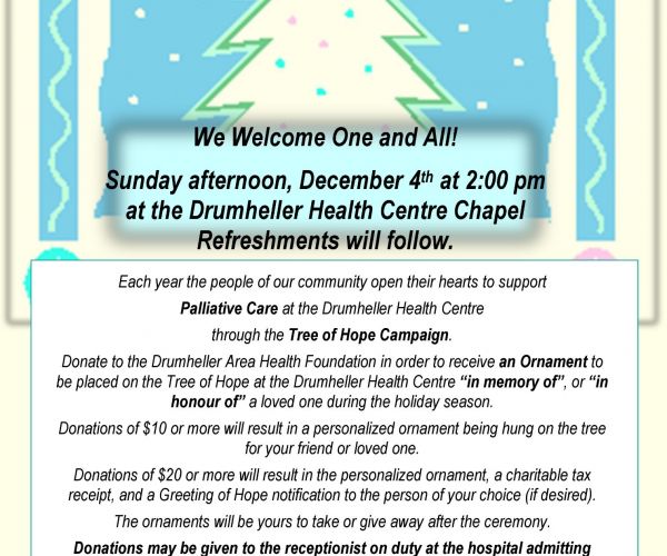 After being cancelled for two years, the Tree of Hope is back for 2022! You can donate online at https://www.drumhellerhealthfoundation.com/online-donations by selecting your Gift Designation as Tree of Hope - Palliative Care. In the Comments, you can provide your ornament and Greeting of Hope information. Join us on Sunday, December 4th at 2:00 pm to light the Tree of Hope!