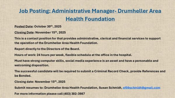 Submit resumes to: Drumheller Area Health Foundation, Susan Schmidt,